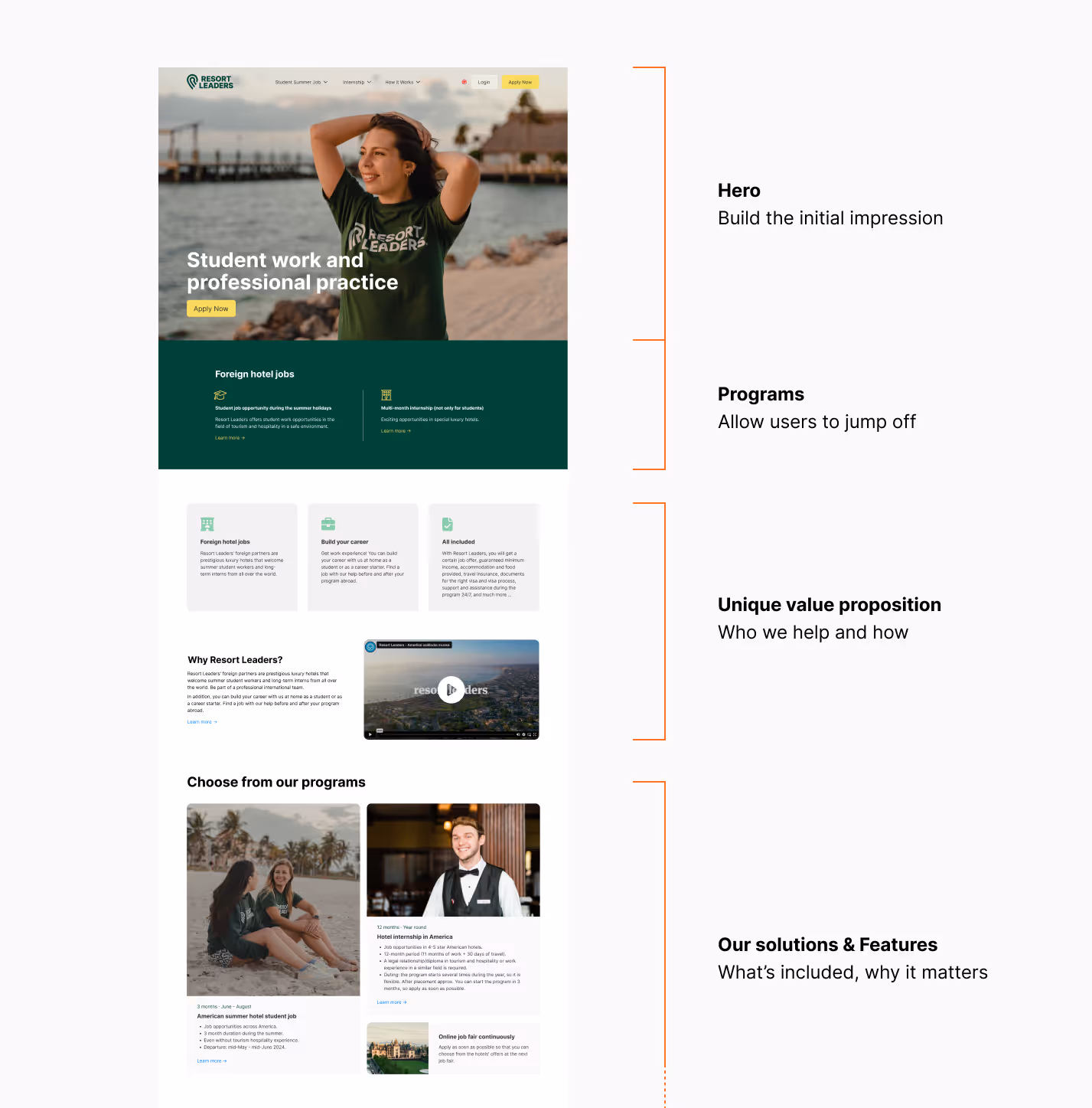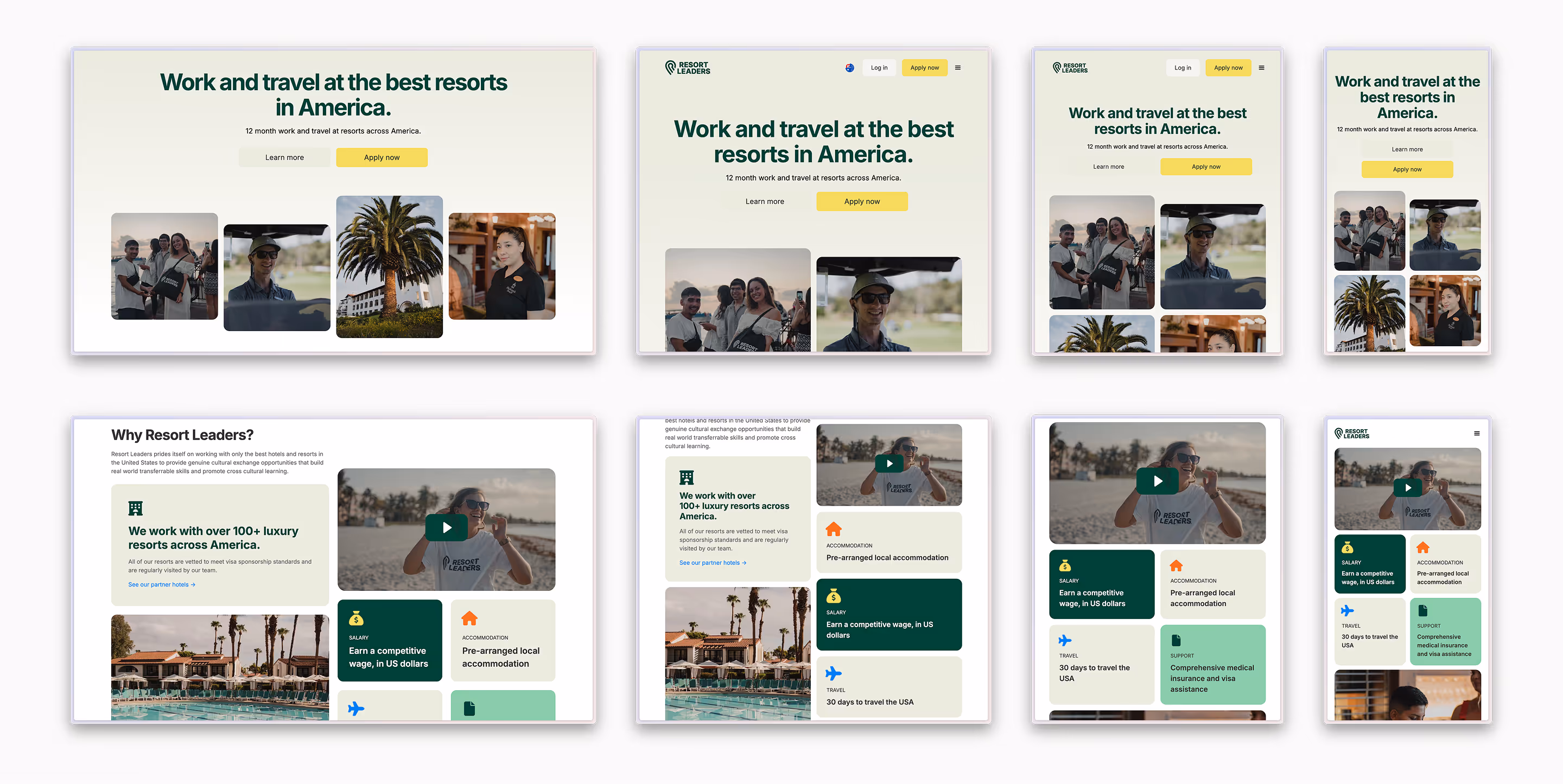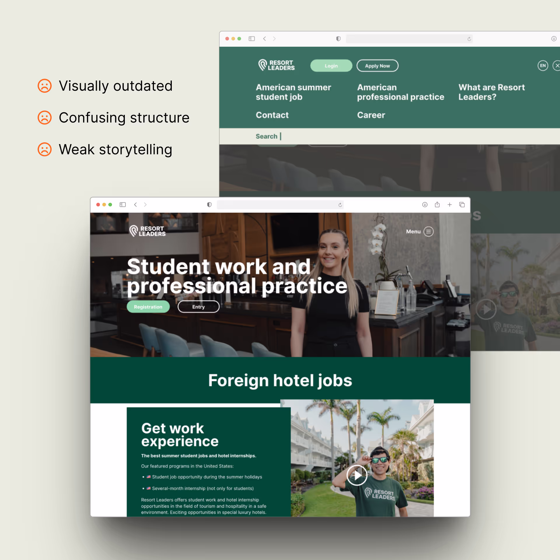 Resort Leaders is an educational travel brand connecting students with seasonal resort jobs in the U.S. The previous website hadn’t been updated in years—its visual style was outdated, and the content structure had become cluttered and hard to navigate.
