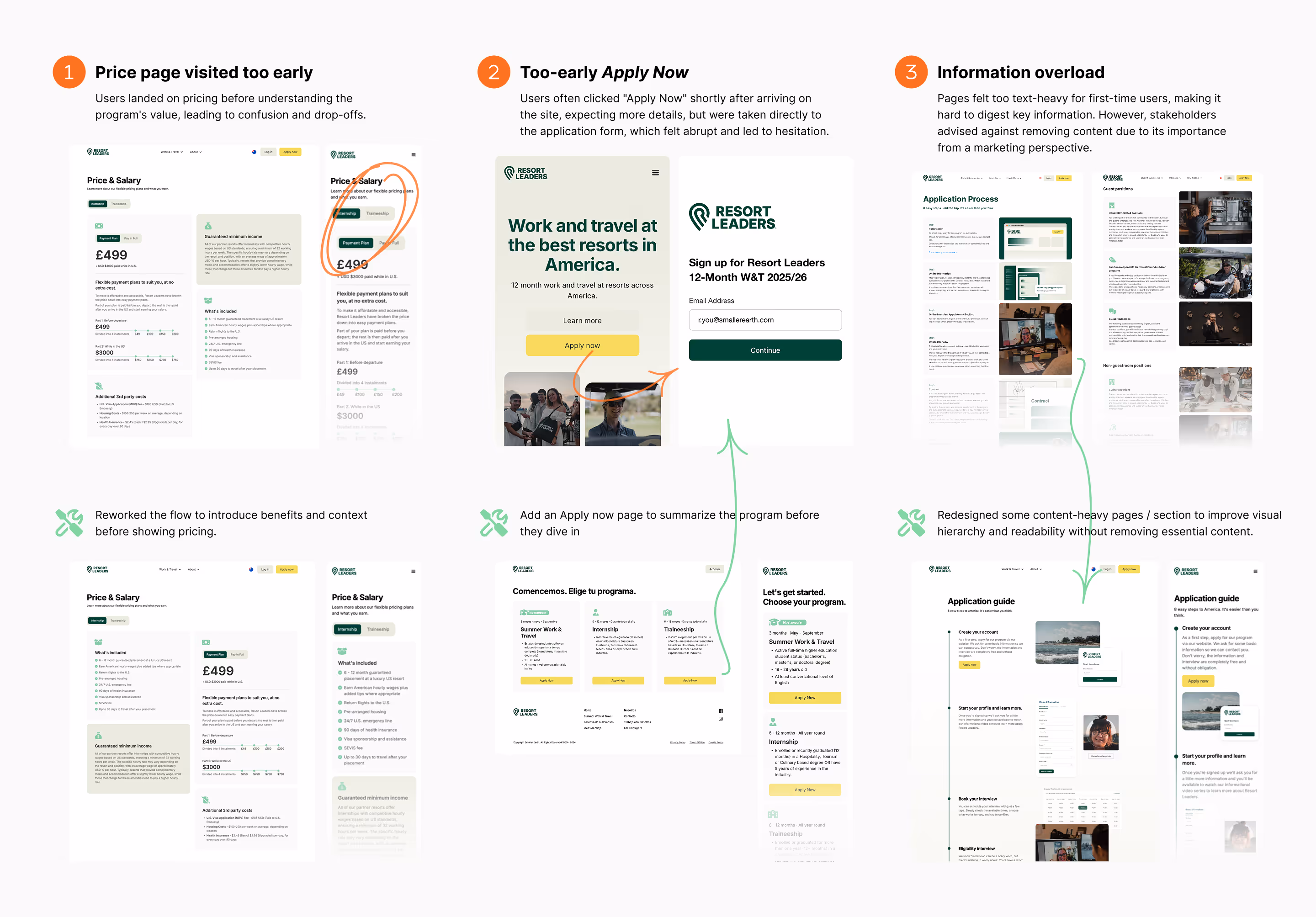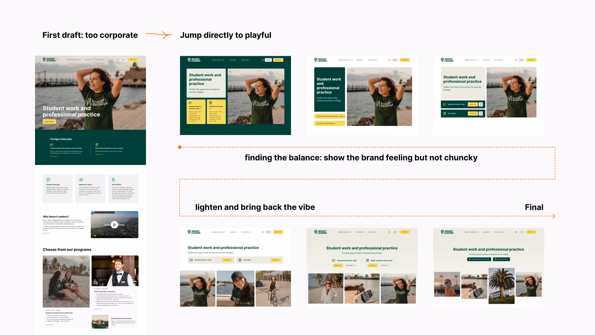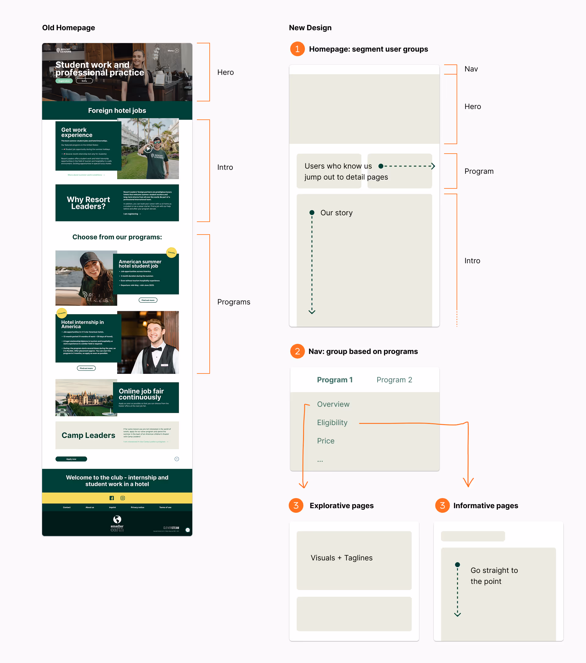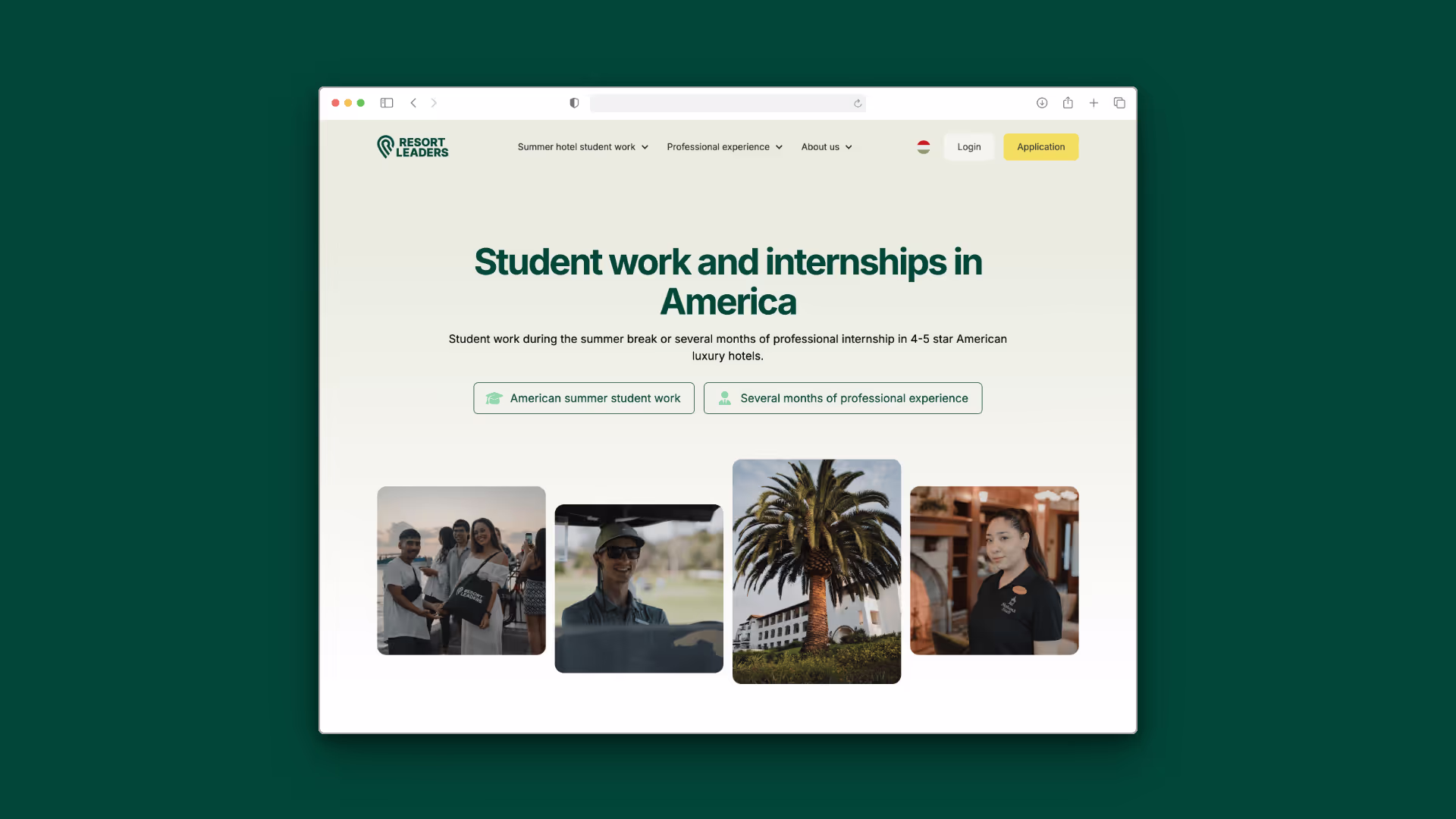 Resort Leaders is an educational travel brand connecting students with seasonal resort jobs in the U.S. The previous website hadn’t been updated in years—its visual style was outdated, and the content structure had become cluttered and hard to navigate.