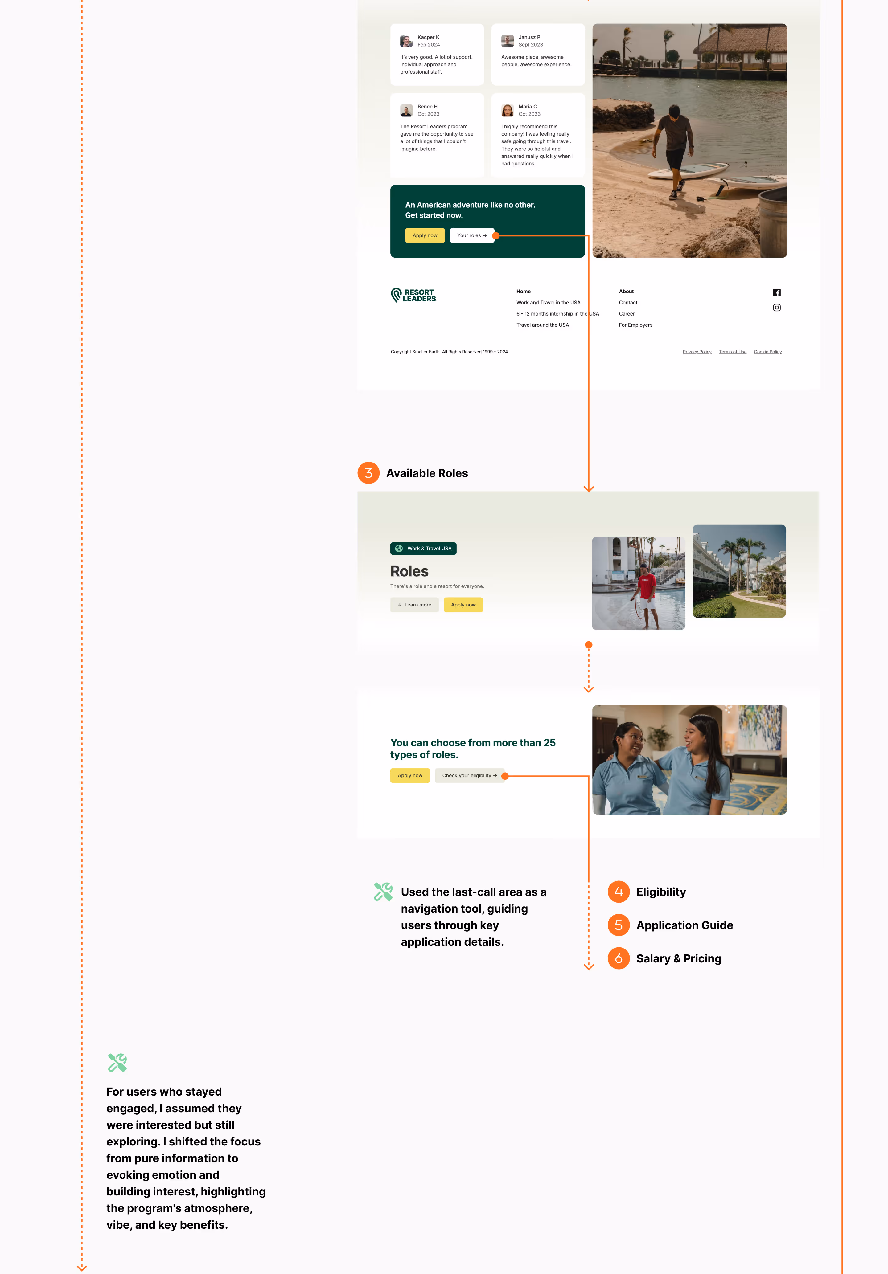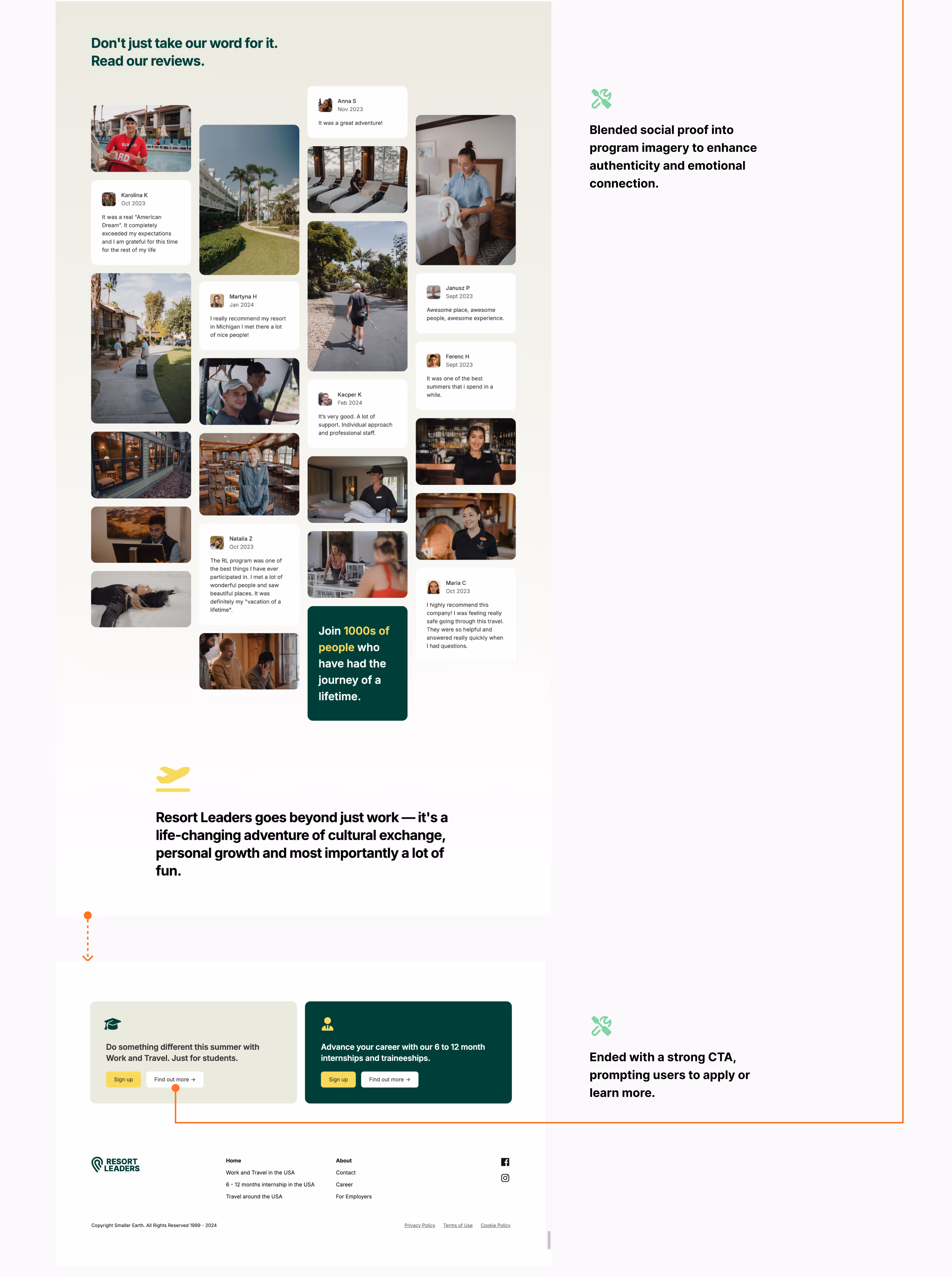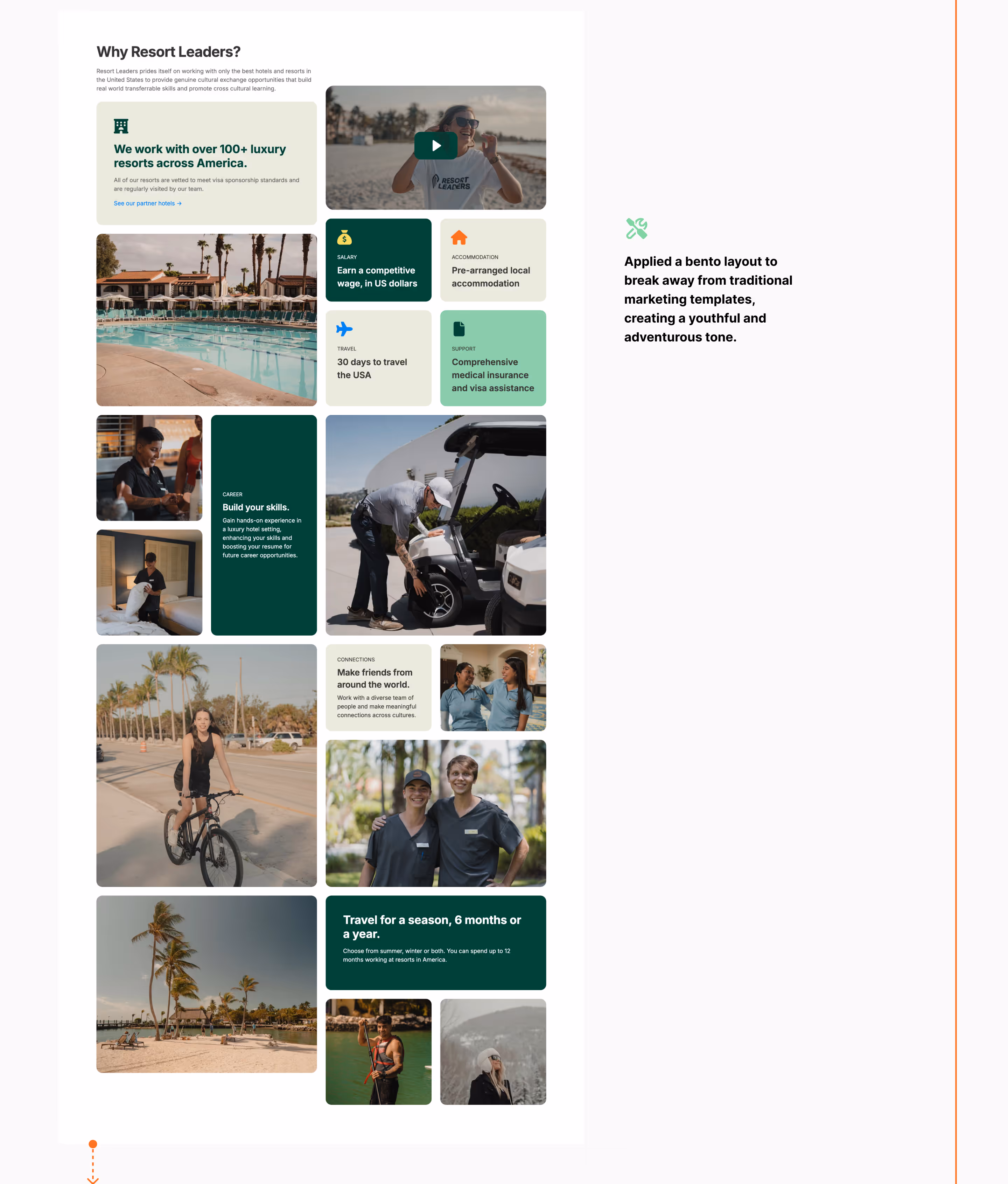Resort Leaders is an educational travel brand connecting students with seasonal resort jobs in the U.S. The previous website hadn't been updated in years—its visual style was outdated, and the content structure had become cluttered and hard to navigate. With the company transitioning to Webflow for better flexibility and faster iteration, I was tasked with leading the redesign.