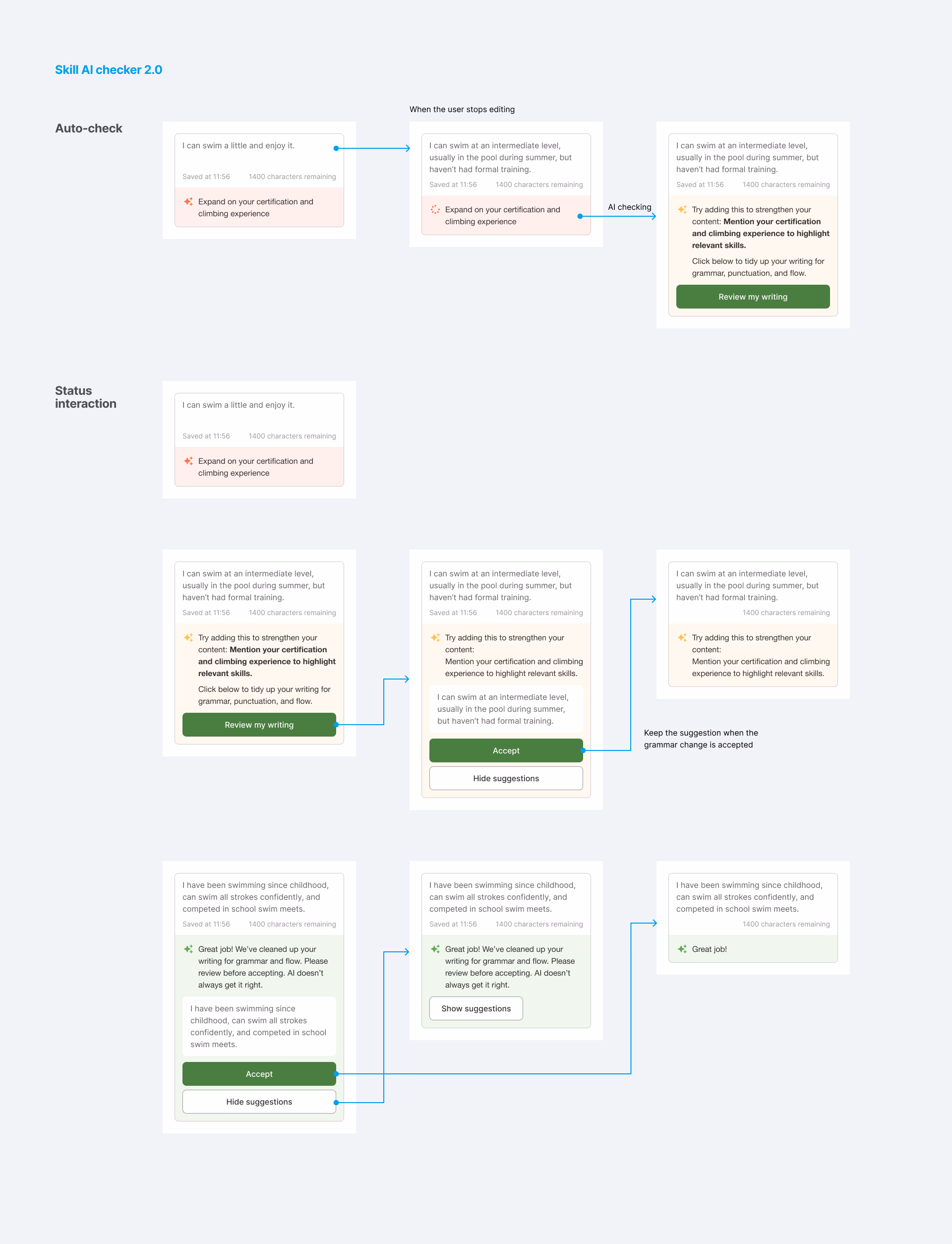 Surprisingly, the demo showed the experience wasn’t as annoying as I feared. Because this was more like a questionnaire than a resume builder, users naturally wrote short sentences. Setting the auto-check with a slight delay (I tested 1 second) actually helped me complete my own skill description faster.